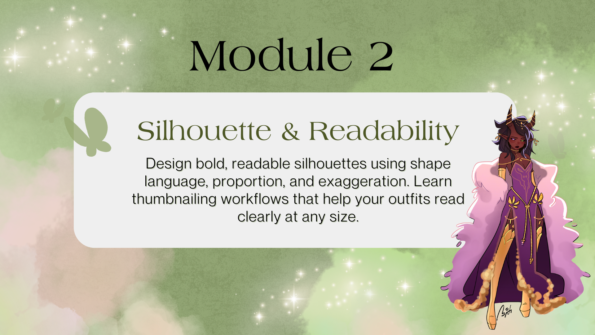 Create stylish, intentional character costumes using strong silhouettes, smart fabric choices, and clear visual hierarchy—no more overworked or confusing designs.