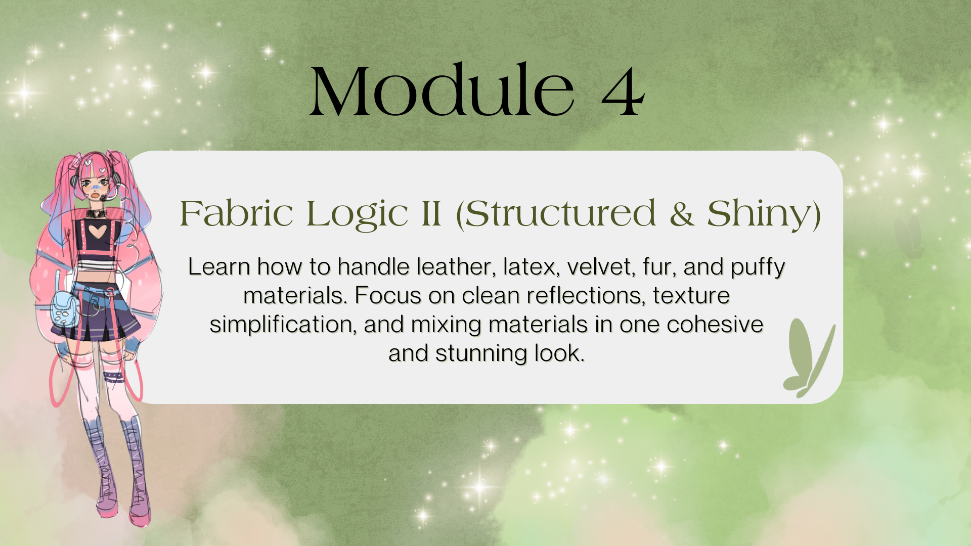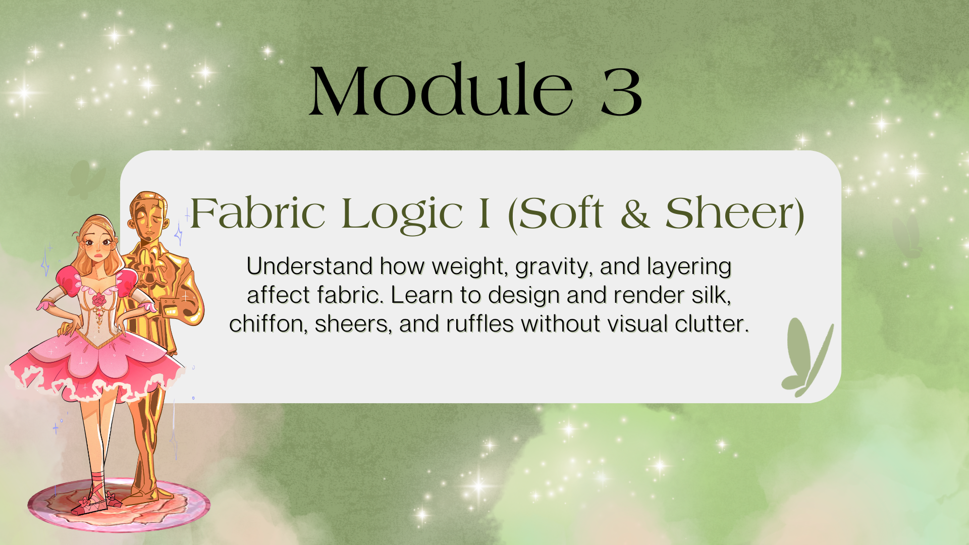 The course is designed to be as practical as possible, covering everything from the basics of silhouettes, fabrics, and color, to full outfit renders. And the best part? You can replay lessons anytime, anywhere, so you never miss a detail.